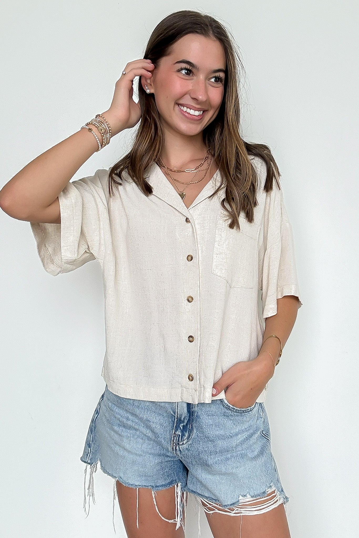 Details: Crisp, cool, and made for golden hour moments—our Salt + Citrus button-up is the ultimate chill-girl staple. With an easy, boxy fit and airy fabric that moves with you, this top is a go-to for beach days, coffee runs, and everything in between. Available in sun-washed Kiwi and soft Natural, it's the kind of top that looks just as good half-tucked with denim as it does open over a tank. Trust us—you'll reach for it on repeat.