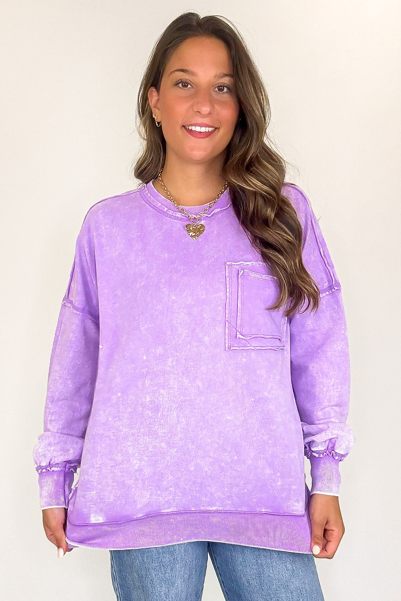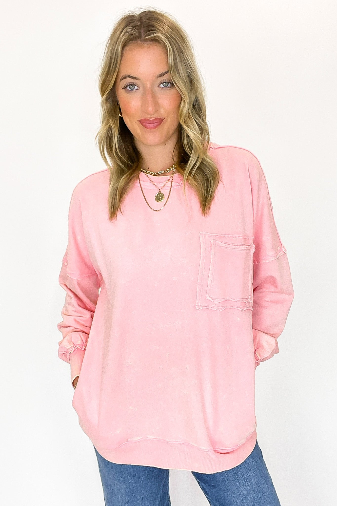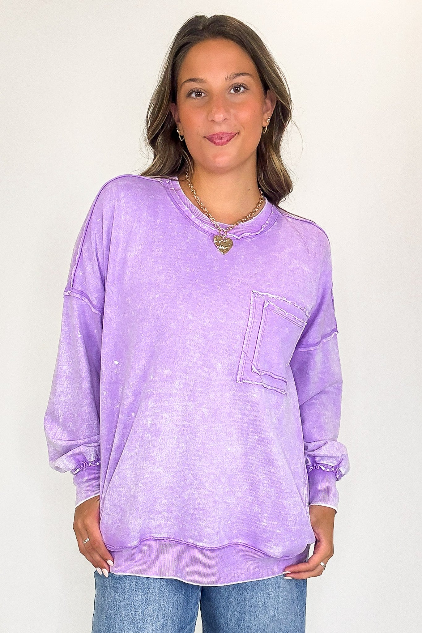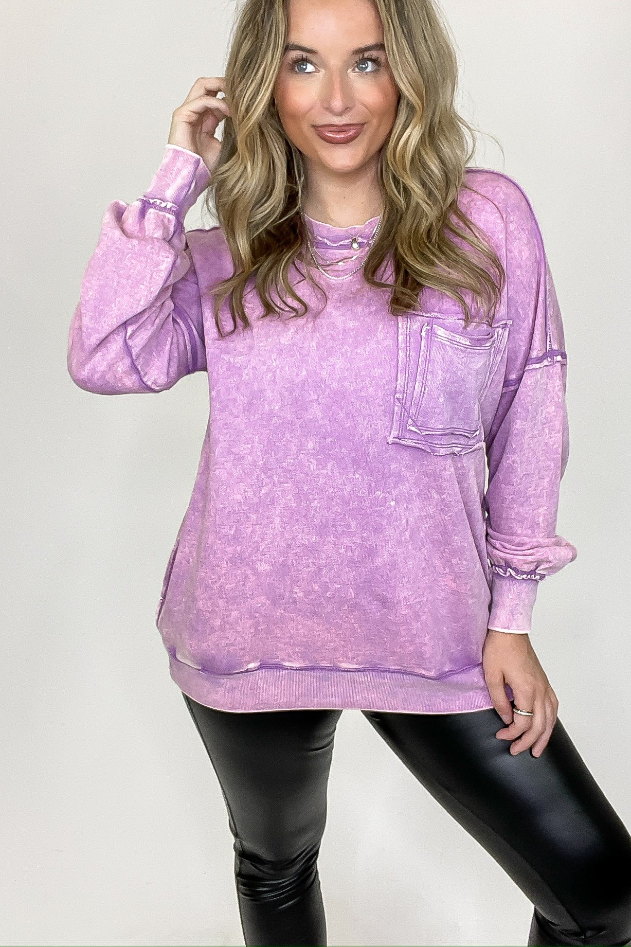 Details: Rock out in this Acid Wash Raw Edge Pullover featuring a classic acid wash with raw-edge vibes. Step it up with a double back seam and back patch pocket for an edgy look! Throw it on and kick up the cool-factor with this stylish essential.