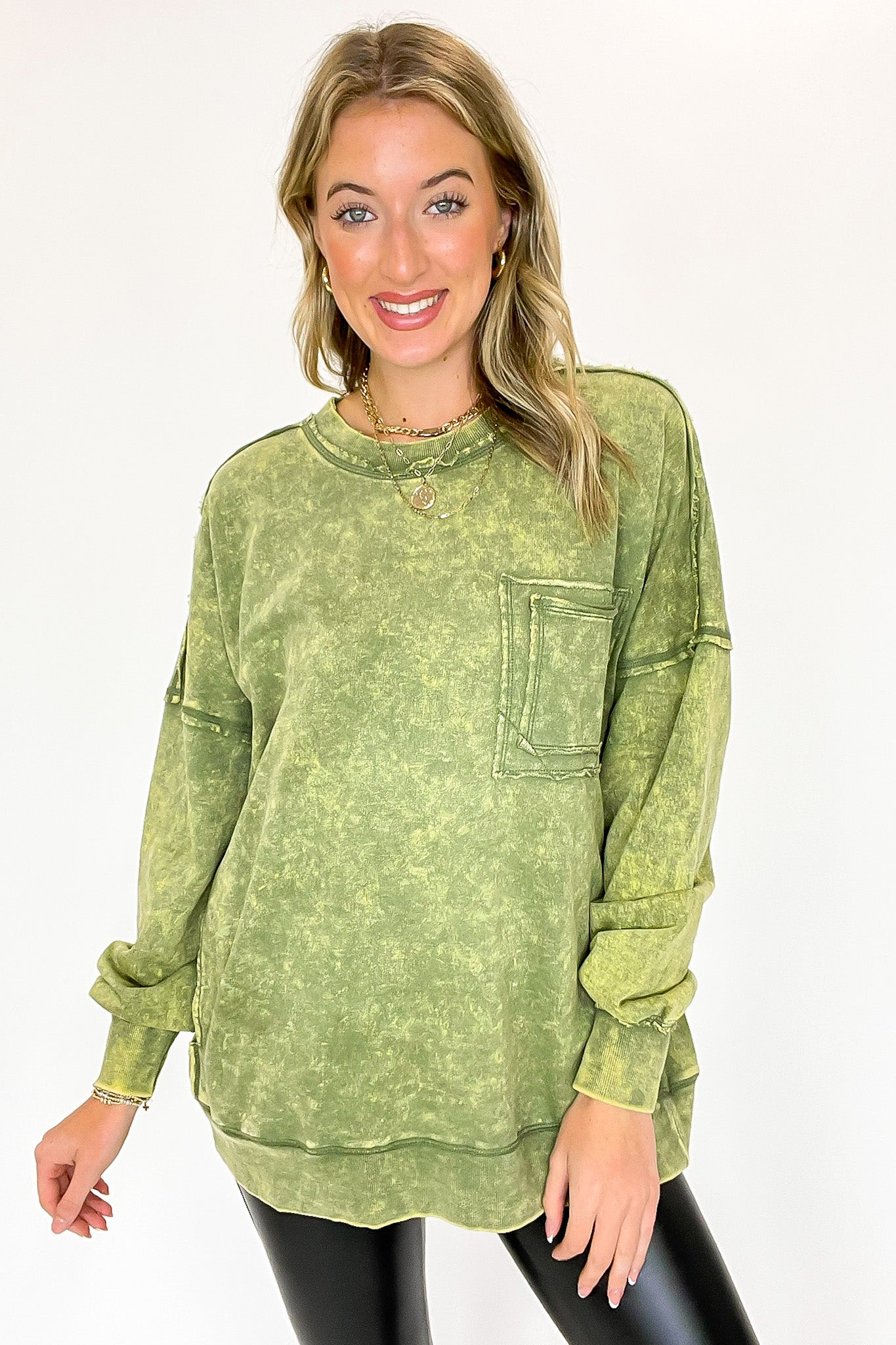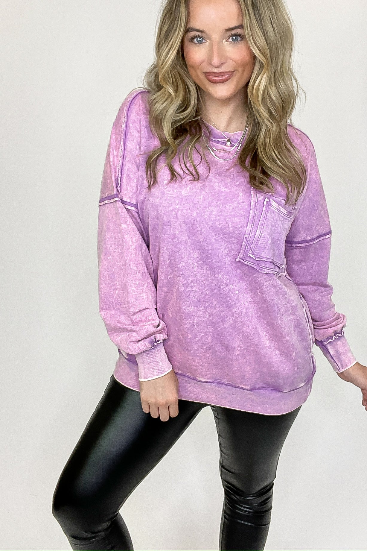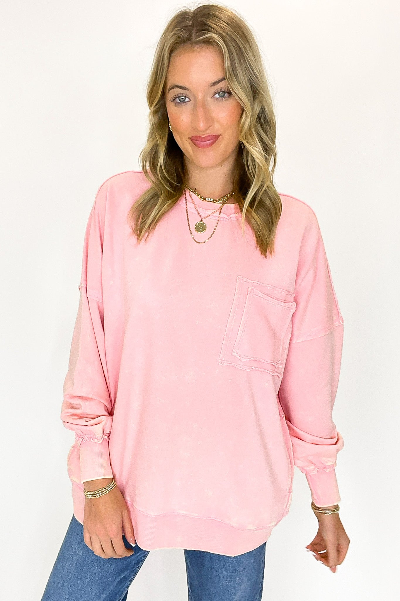 Details: Rock out in this Acid Wash Raw Edge Pullover featuring a classic acid wash with raw-edge vibes. Step it up with a double back seam and back patch pocket for an edgy look! Throw it on and kick up the cool-factor with this stylish essential.
