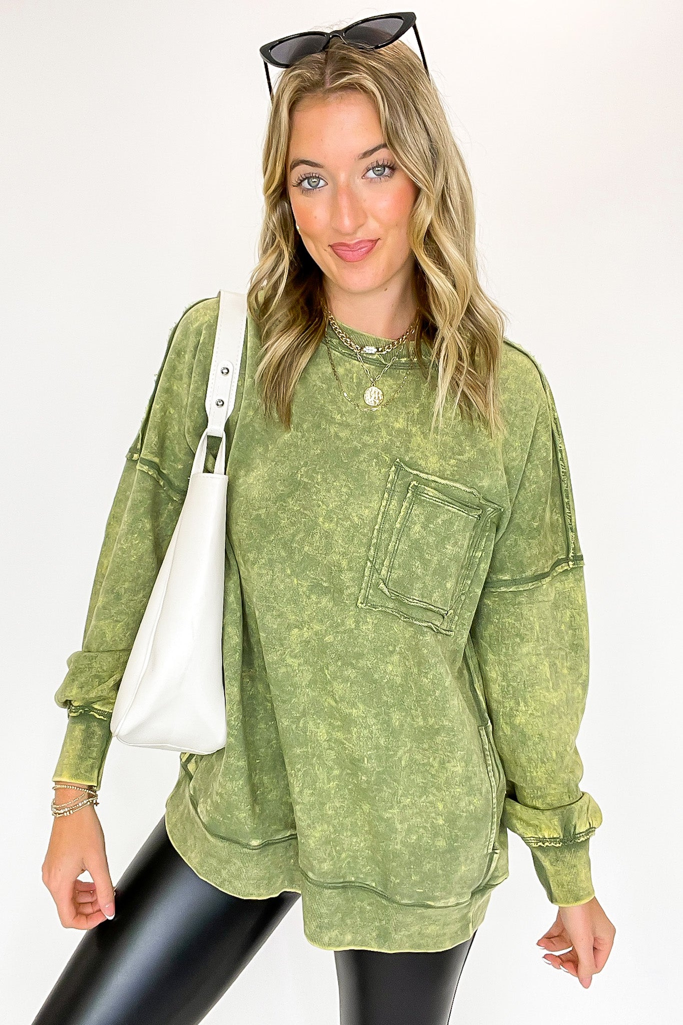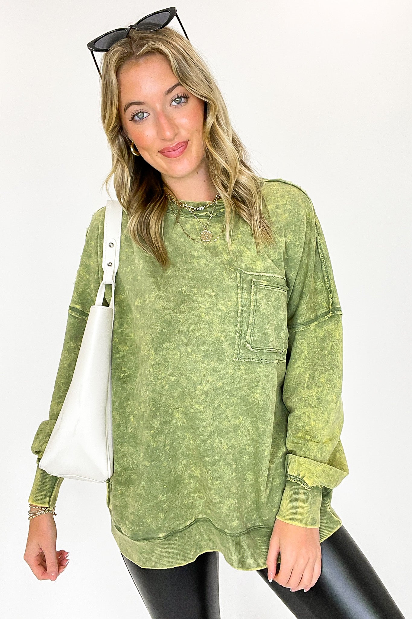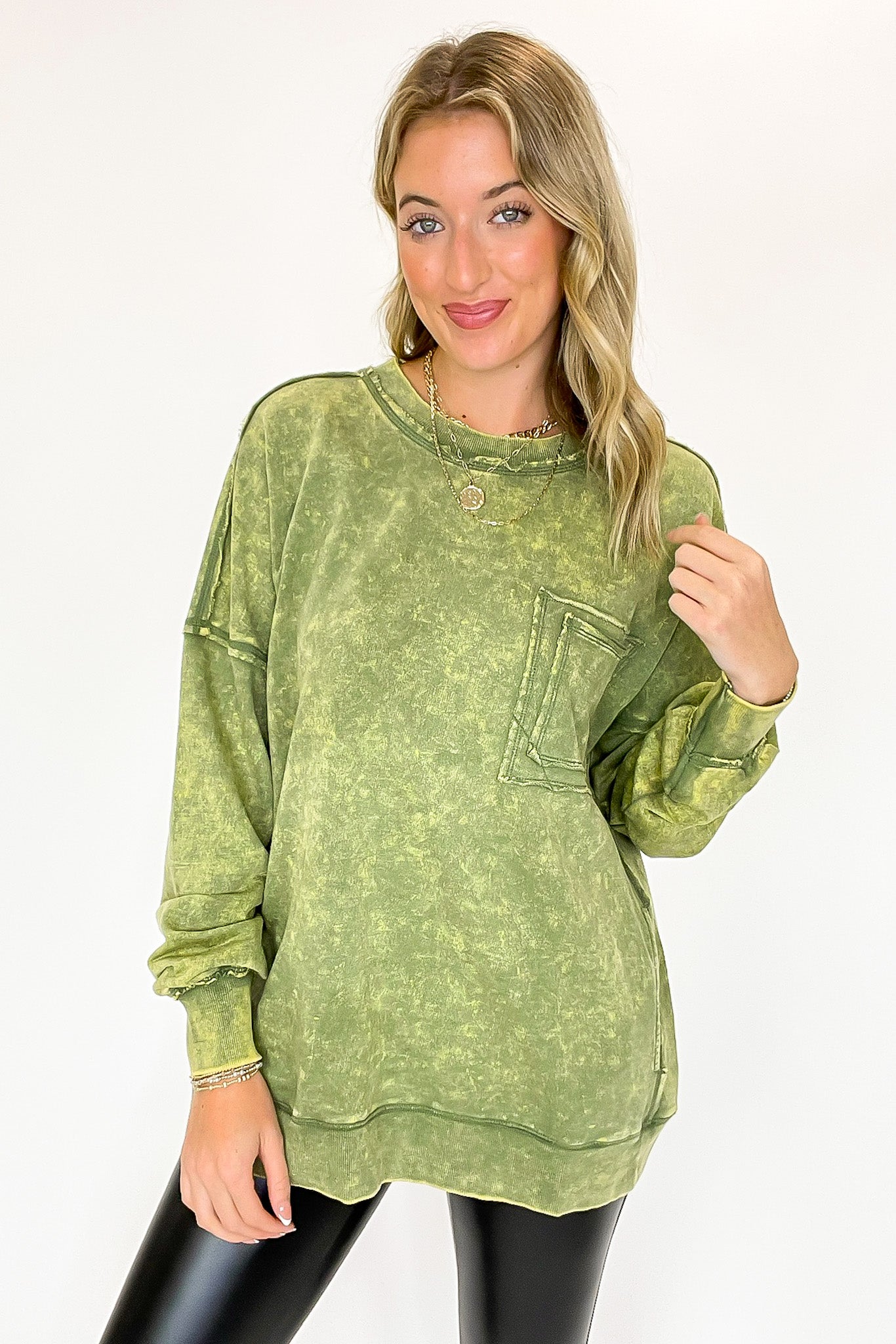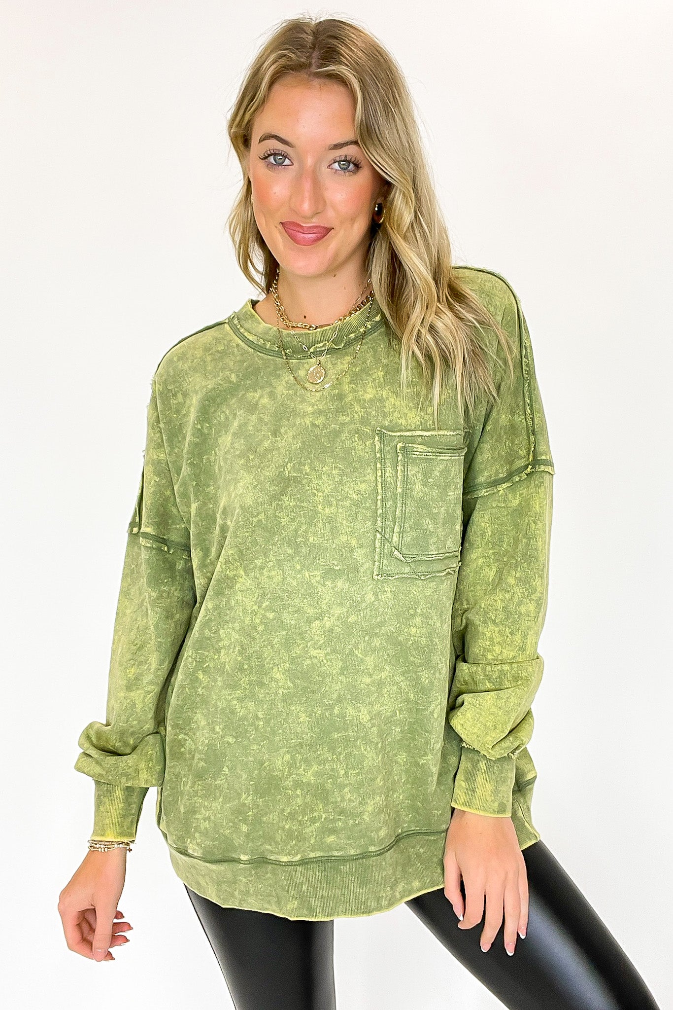 Details: Rock out in this Acid Wash Raw Edge Pullover featuring a classic acid wash with raw-edge vibes. Step it up with a double back seam and back patch pocket for an edgy look! Throw it on and kick up the cool-factor with this stylish essential.