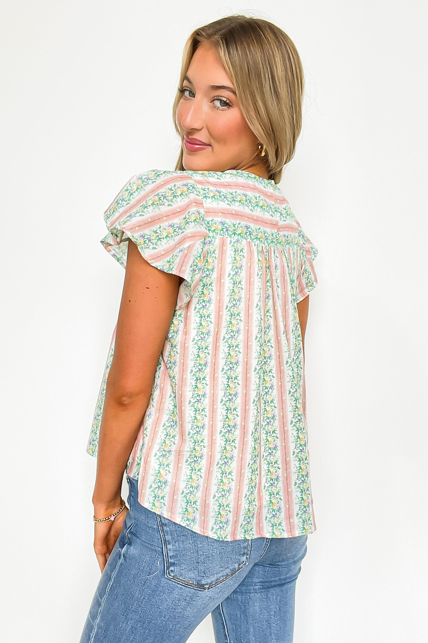 Details: This playful top combines feminine floral stripes with ruffled sleeves and a flirty back keyhole detail. Perfect for adding a touch of whimsy to your wardrobe.