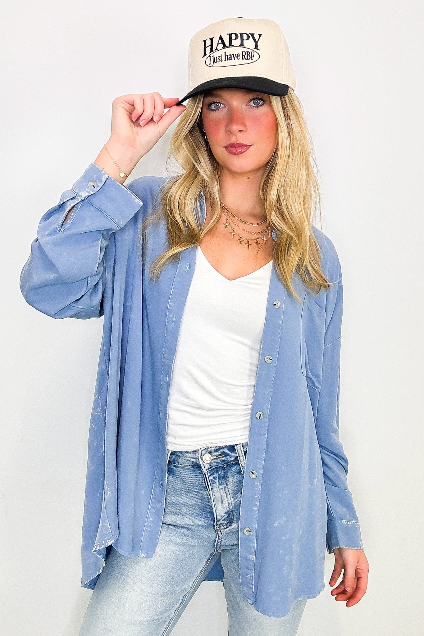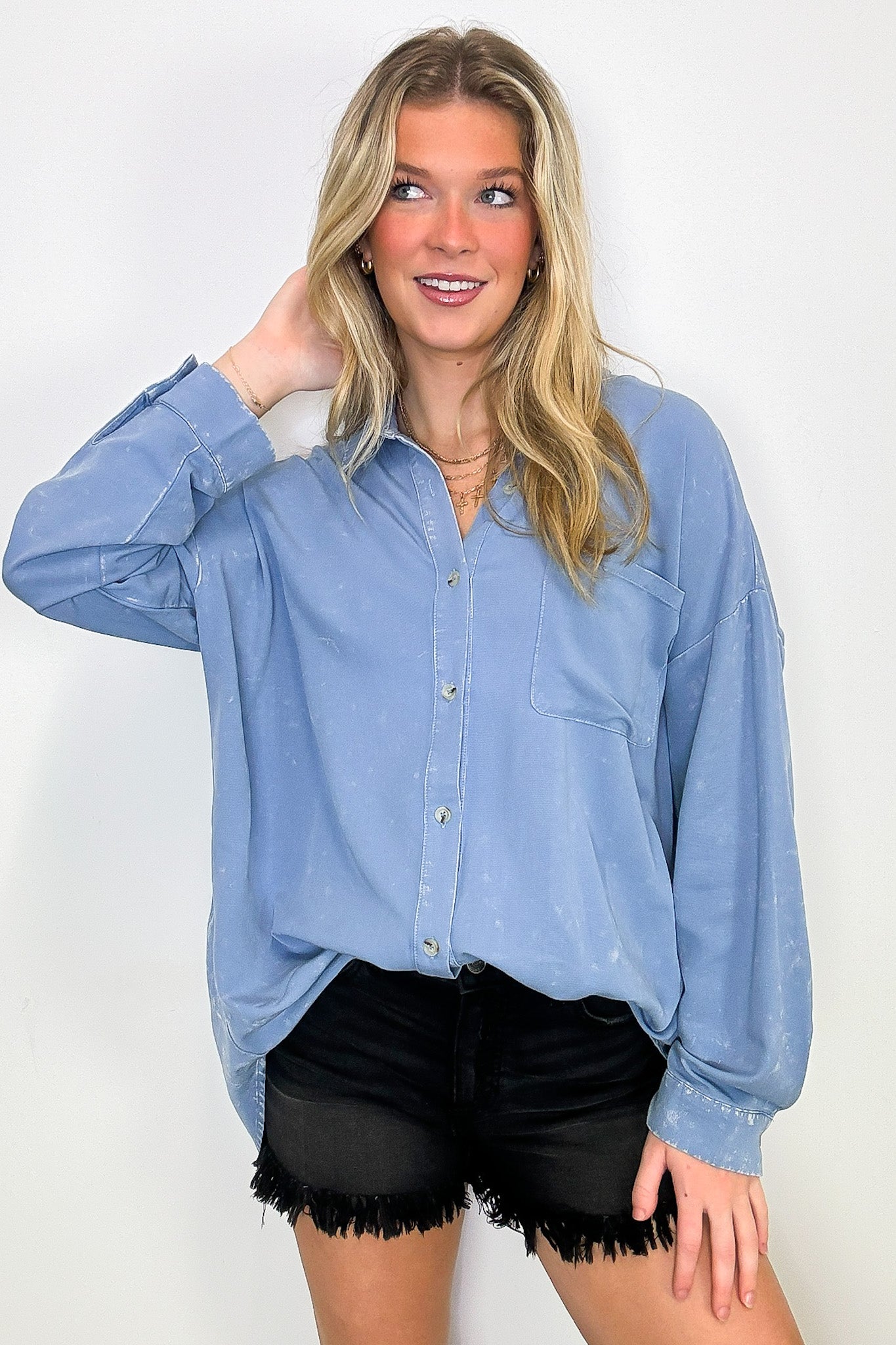 Details: Add a touch of style with this mineral wash button down top. The lightweight woven challis fabric and rolled sleeves provide comfort, while the button down front and patch pocket add functionality. Perfect for a casual day out!
