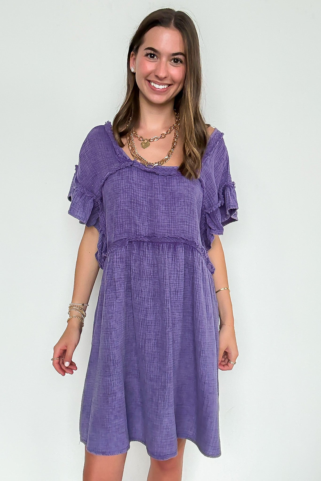 Details: Feminine with a touch of vintage edge — the Torria Mineral Washed Dress is your new statement staple. Featuring a flattering square neckline, delicate ruffle sleeves, and a soft mineral-washed finish, this dress combines romance with just the right amount of undone cool.