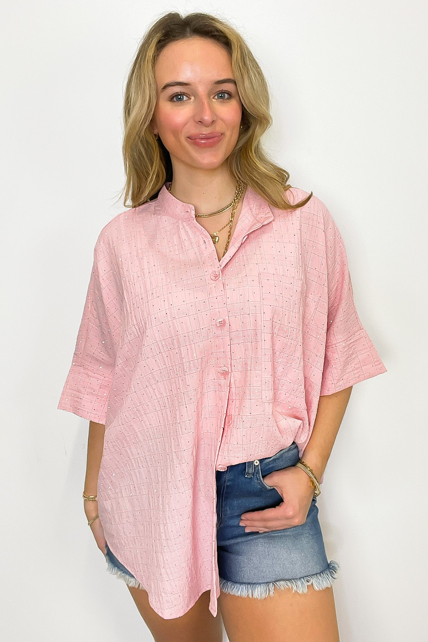 Details: This top is a definite crowd pleaser with its heat-stamped rhinestone embellishments and unique stand collar. The pleat back detail and drop shoulder add a touch of sophistication to the short-sleeved, relaxed fit design. Make a statement and turn heads with this stylish and comfortable shirt.
